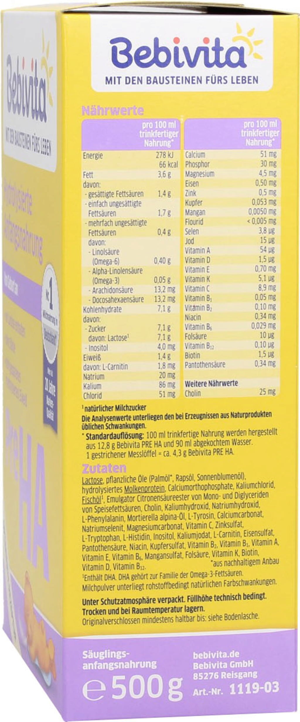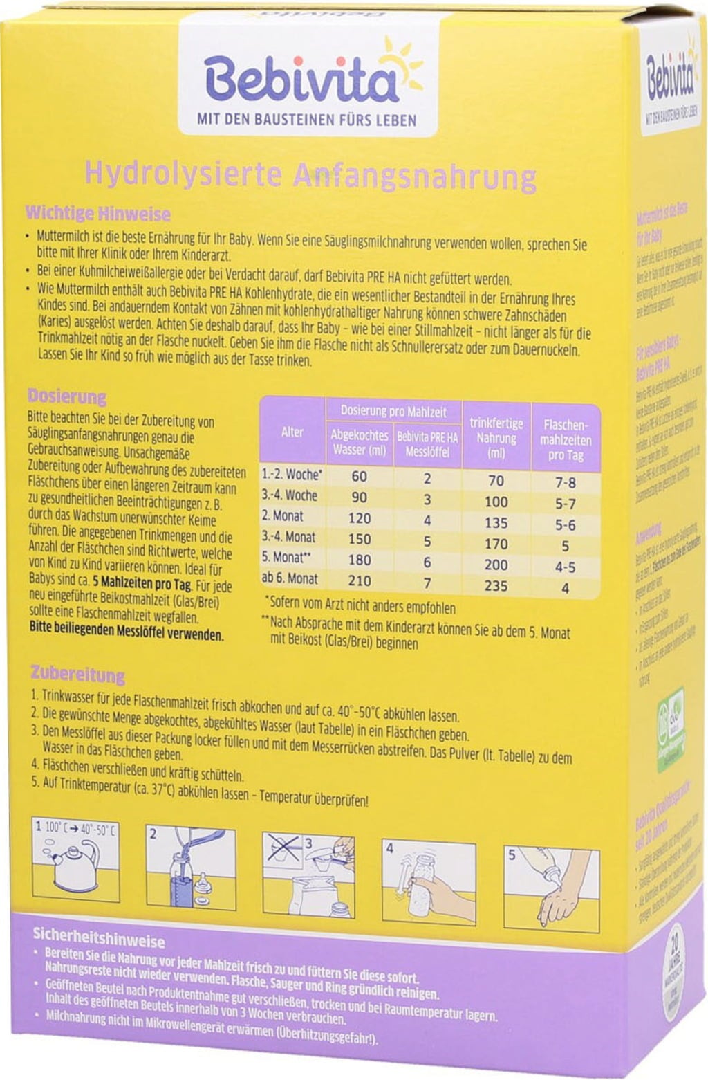 Die Zusammensetzung, die Zutaten und der Produktionsprozess der Bebivita Pre HA Säuglingsanfangsnahrung unterliegen strengsten deutschen Qualitätsrichtlinien und werden regelmäßig streng kontrolliert. Das Produkt entspricht den gesetzlichen Vorschriften.
