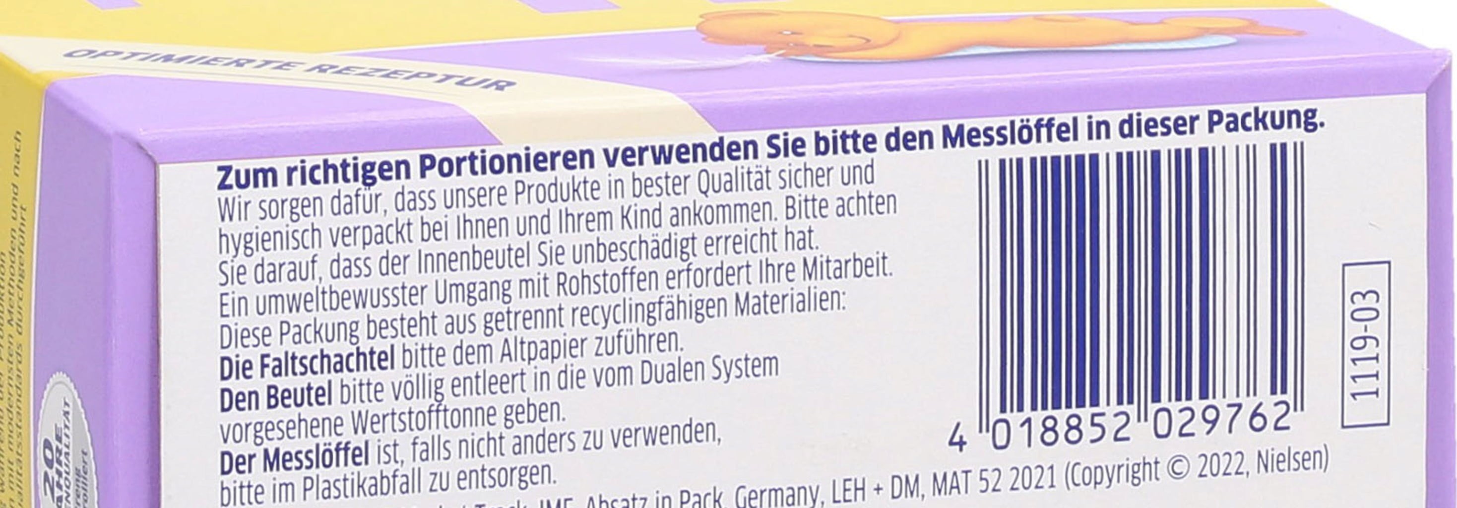 Die angegebenen Trinkmengen und die Anzahl der Fläschchen sind Richtwerte, welche von Kind zu Kind variieren können. Ideal für Babys sind ca. 5 Mahlzeiten pro Tag. Für jede neu eingeführte Beikostmahlzeit (Glas/Brei) sollte eine Flaschenmahlzeit wegfallen. Bitte beiliegenden Messlöffel verwenden.