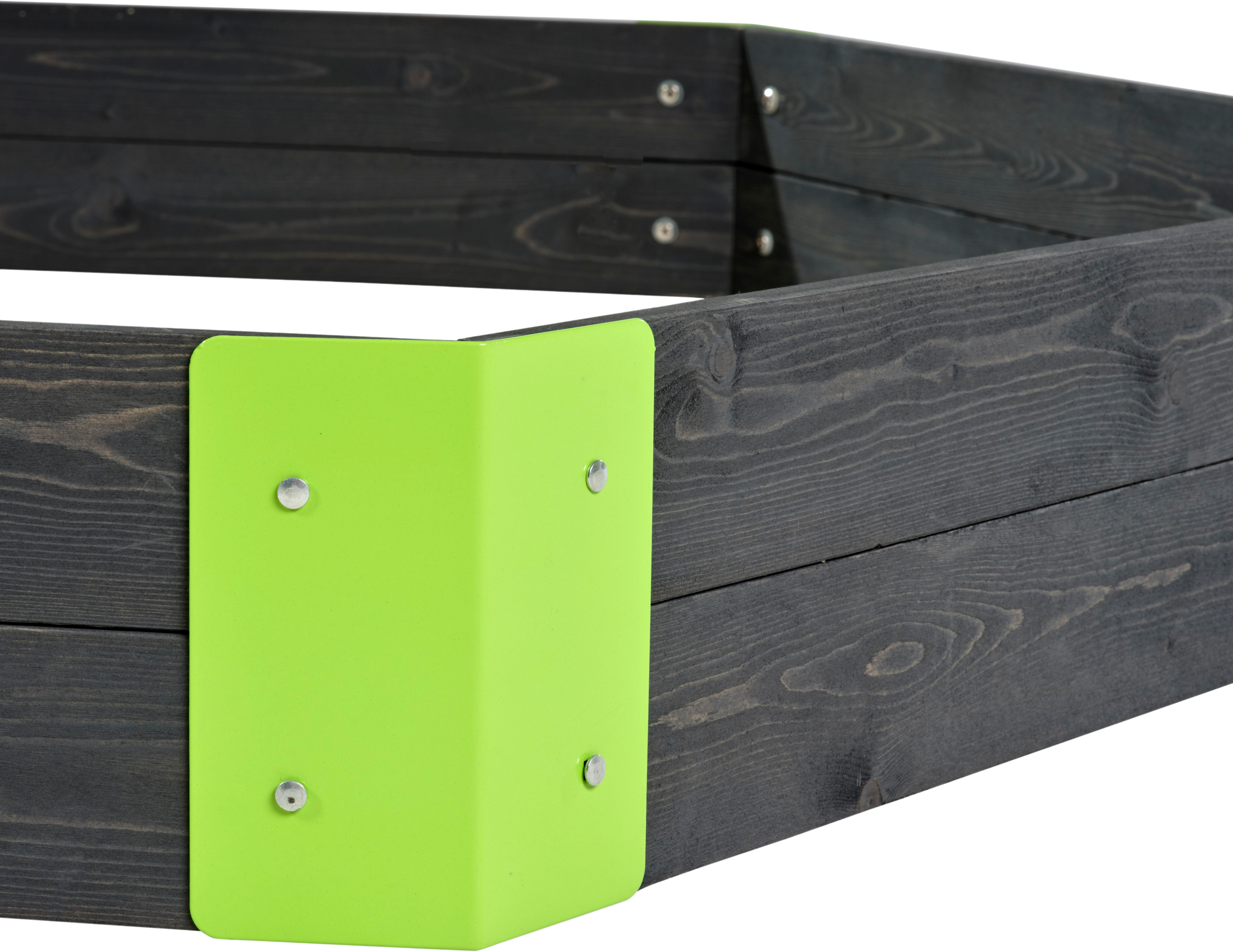 Besonders praktisch: Der Holzsandkasten verfügt über vorgebohrte Bretter, sodass die Montage ganz einfach ist. Er kommt mit Metallhaken und Metallbeschlägen zu dir nach Hause, welche für die notwendige Stabilität sorgen. Das graue Holz und die grünen Ecken unterstreichen das moderne Design, welches durch drei Holzsitze in den Ecken perfekt abgerundet wird!