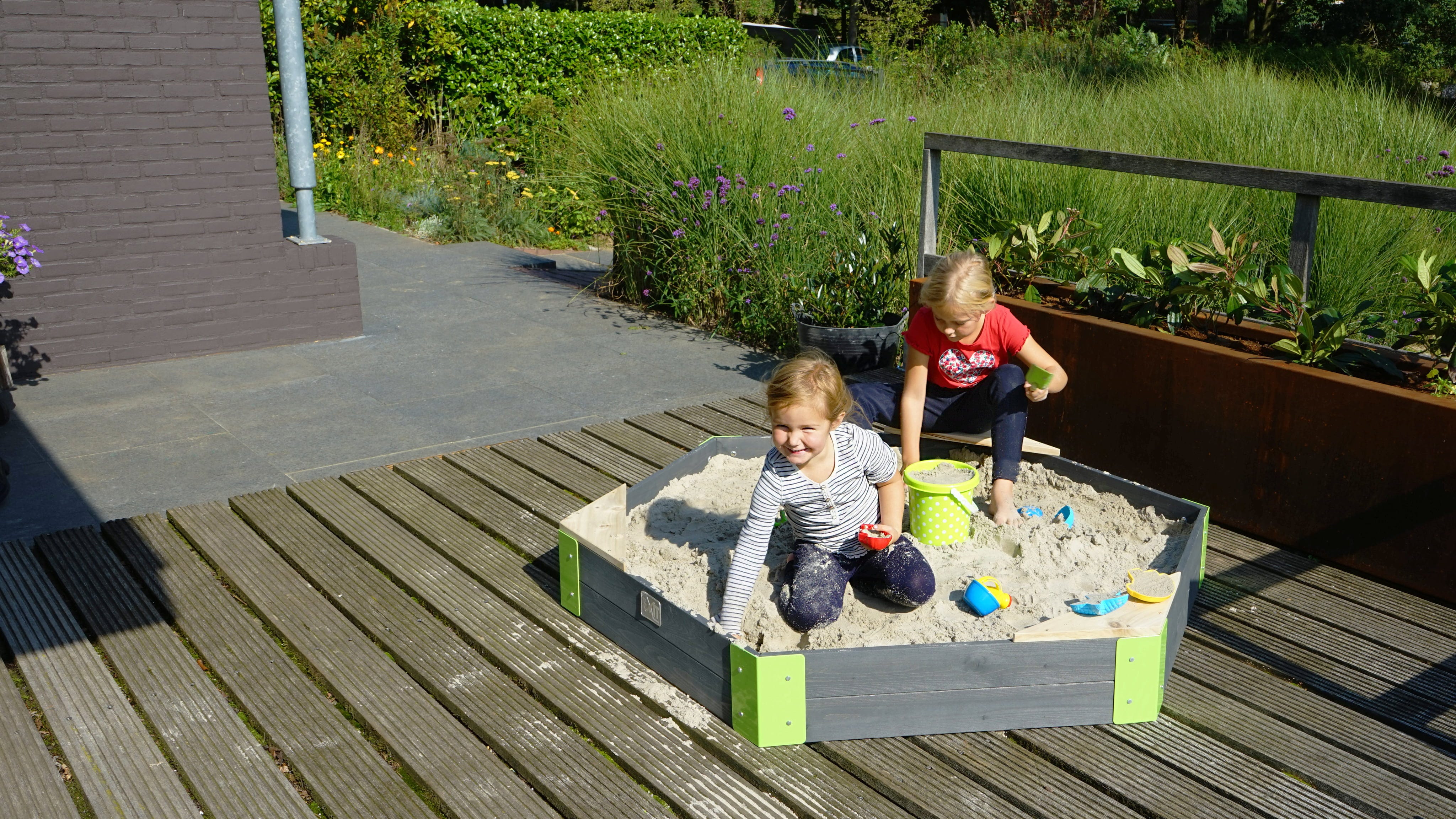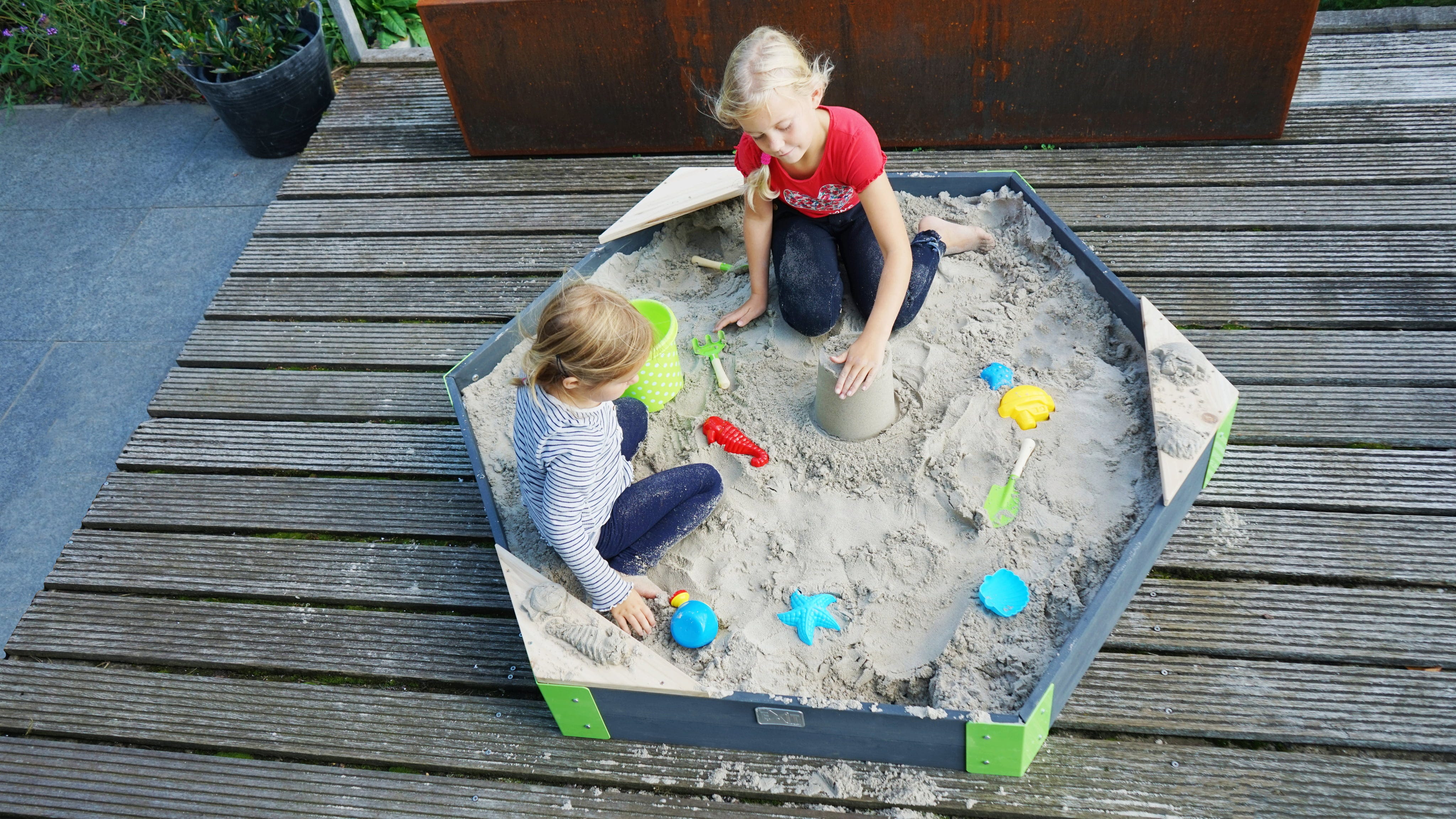 Ausgedehntes Spielen im Sandkasten ist für viele eine wunderschöne Kindheitserinnerung! Mit dem sechseckigen Aksent Holzsandkasten von Exit Toys bereitest du auch deinen Kindern bestimmt eine große Freude!