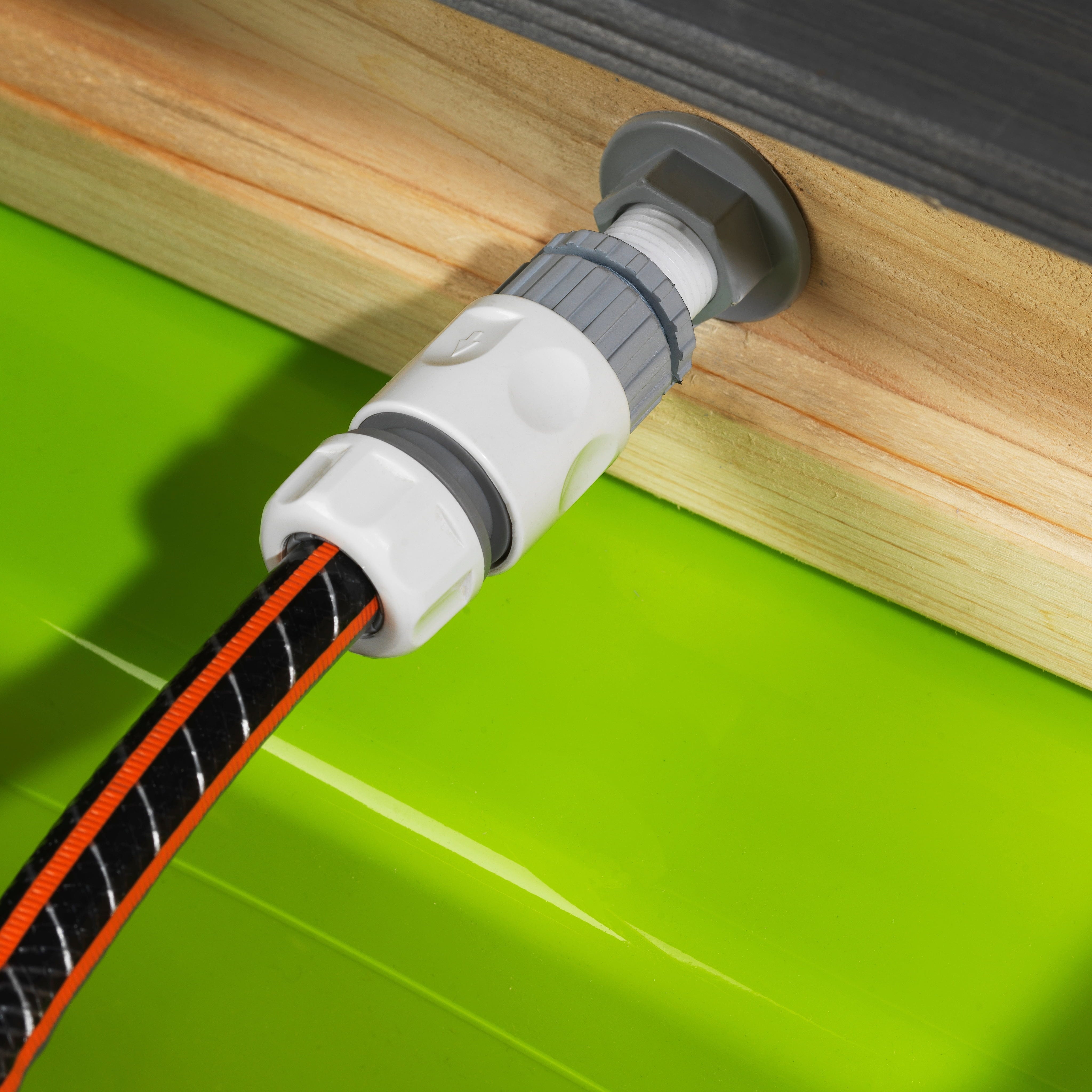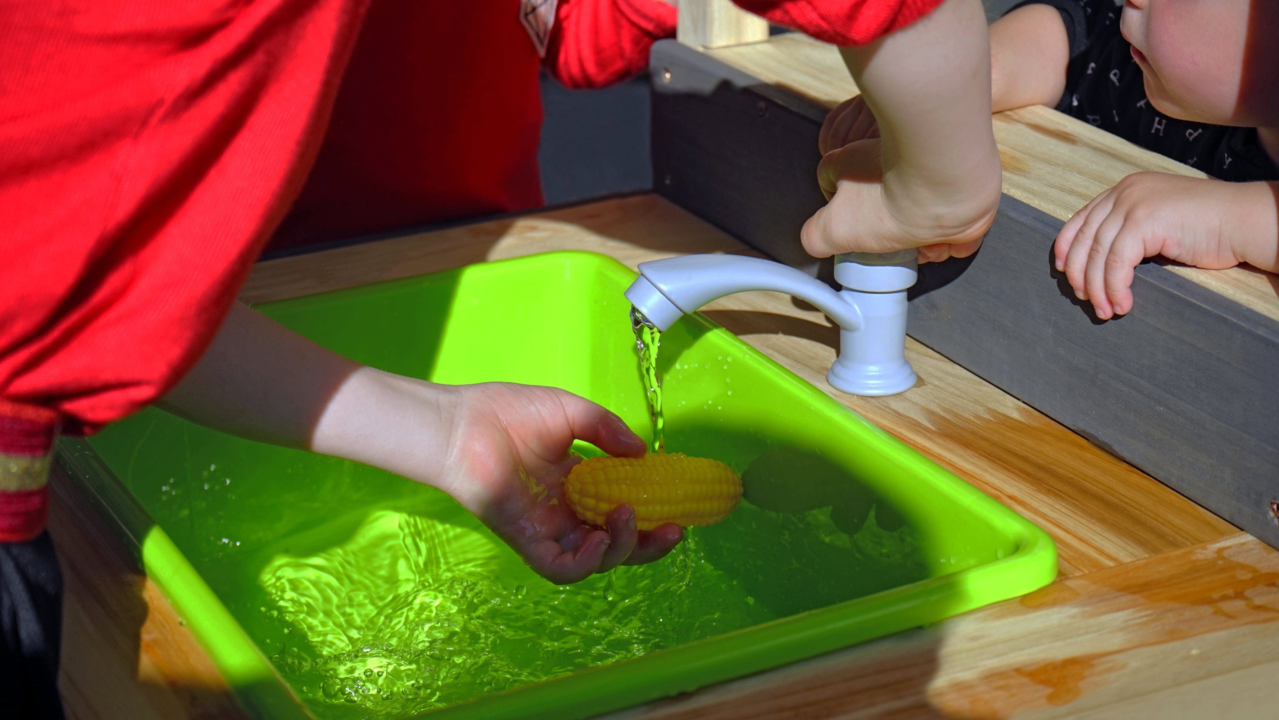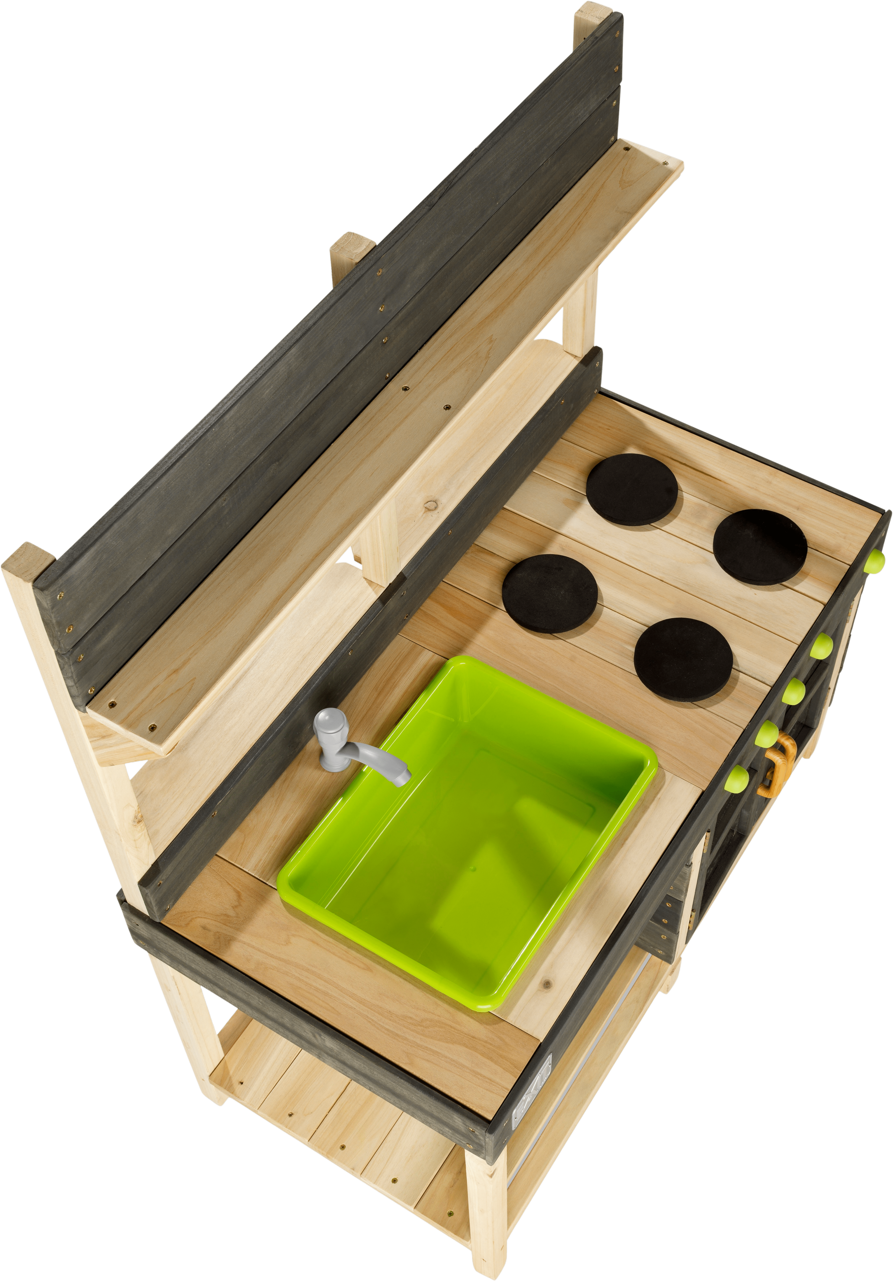 Die Spielküche überzeugt durch ihre realistischen Details: Sie bietet den Kindern einen Herd mit Drehknöpfen sowie einen funktionierenden Wasserhahn, der mit einem Gartenschlauch verbunden werden kann - dank des herausnehmbaren Behälters lässt sich das "Waschbecken" danach schnell wieder ausleeren. Ebenfalls im Lieferumfang enthalten sind ein paar Küchenutensilien, die unter Waschbecken und Herd oder an den Haken über dem Waschbecken Platz finden!