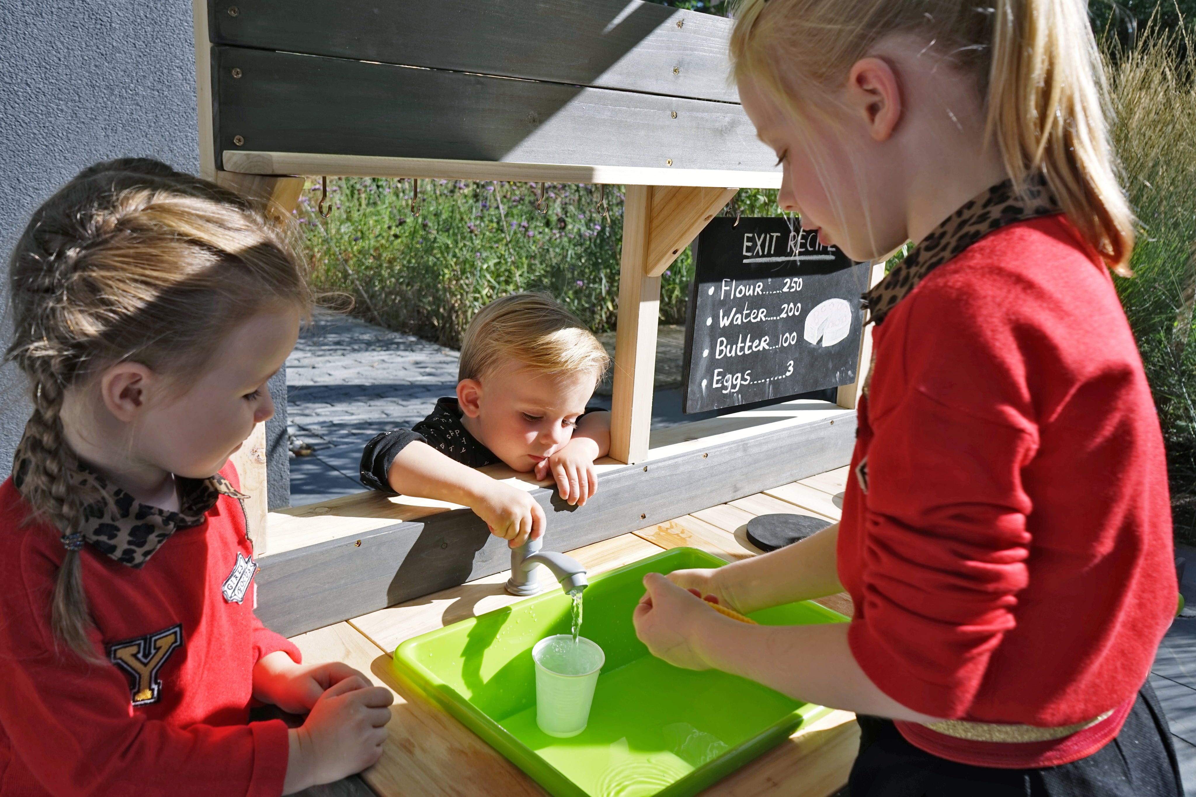 Die Spielküche überzeugt durch ihre vielen realistischen Details: Ein Herd mit Drehknöpfen, ein Backofen für leckere Sandkuchen und natürlich ein funktionierender Wasserhahn, der mit einem Gartenschlauch verbunden werden kann - dank des herausnehmbaren Behälters lässt sich das "Waschbecken" danach schnell wieder ausleeren. Die kleine Kreidetafel und das grüne Dach verleihen der Küche auch das Flair eines Marktstandes, sodass die Kinder ihre selbstgekochten Gerichte auch gleich verkaufen können.