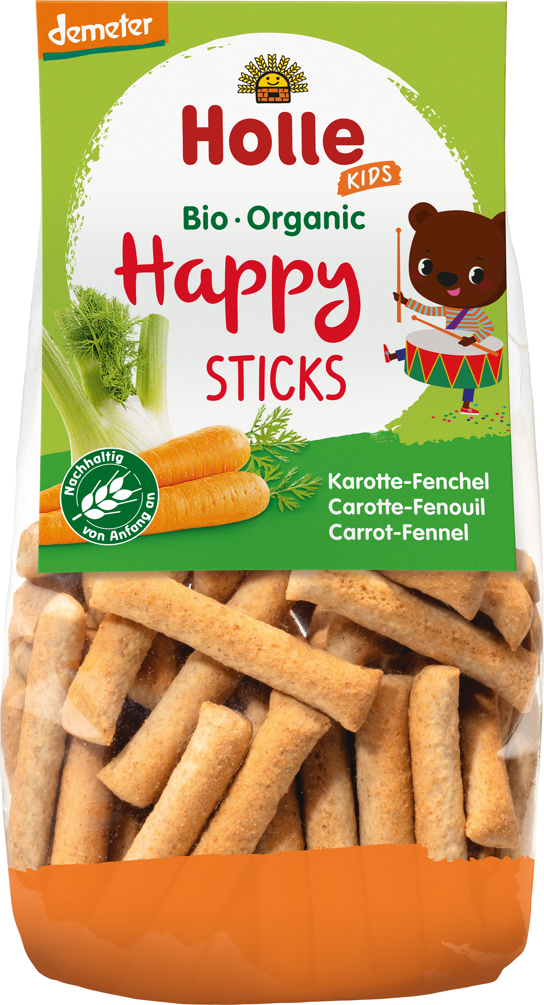 Die Bio Happy Sticks werden aus Demeter-Mehlen gebacken und leicht gesalzen. Somit ein perfekter Gemüse-Knabberspaß für die ganze Familie.
