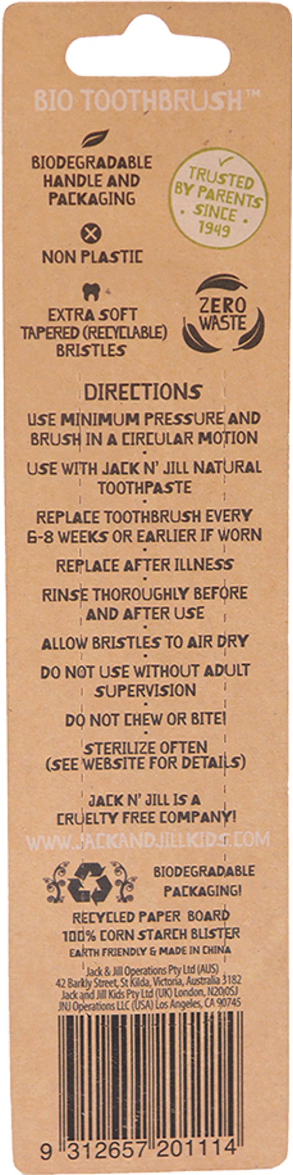 Mit dieser süßen und funktionellen Kinderzahnbürste ist Jack N Jill eine absolute Innovation gelungen: Der Stiel dieser Bio-Zahnbürste besteht aus reiner sowie GMO-freier Maisstärke und einem Bürstenkopf, der aus recyclingfähigem DuPont-Nylon hergestellt wurde. Damit vereint das Produkt Umweltschutz und kinderfreundliches Design. Für tierischen Spaß am Zähneputzen ab dem ersten Zahn!