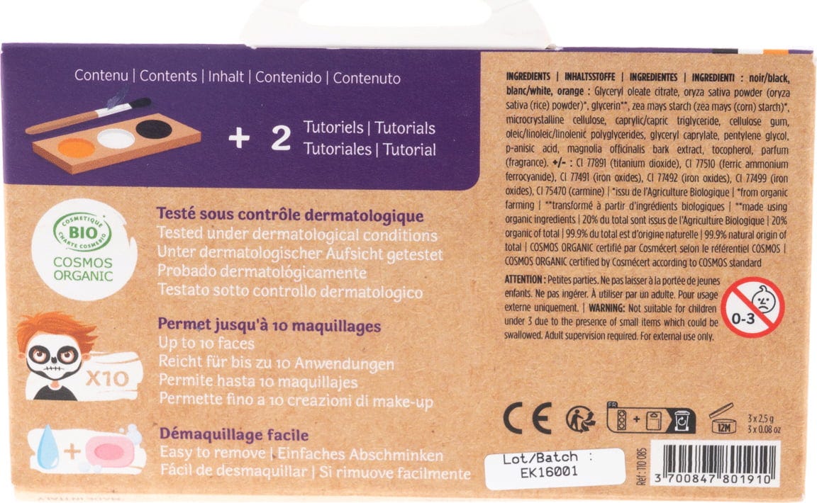 Erschreckend und gruselig wird es mit diesem Schminkset! Allerdings nur die Optionen betreffend: Gruselkürbis oder Skelett? Die Formulierungen hingegen sind alles andere als besorgniserregend: Ganz natürlich, hypoallergen sowie sanft zur Haut. Und auch beim Entfernen gibt es keine bösen Überraschungen - Seife und Wasser lösen alles ganz unkompliziert!