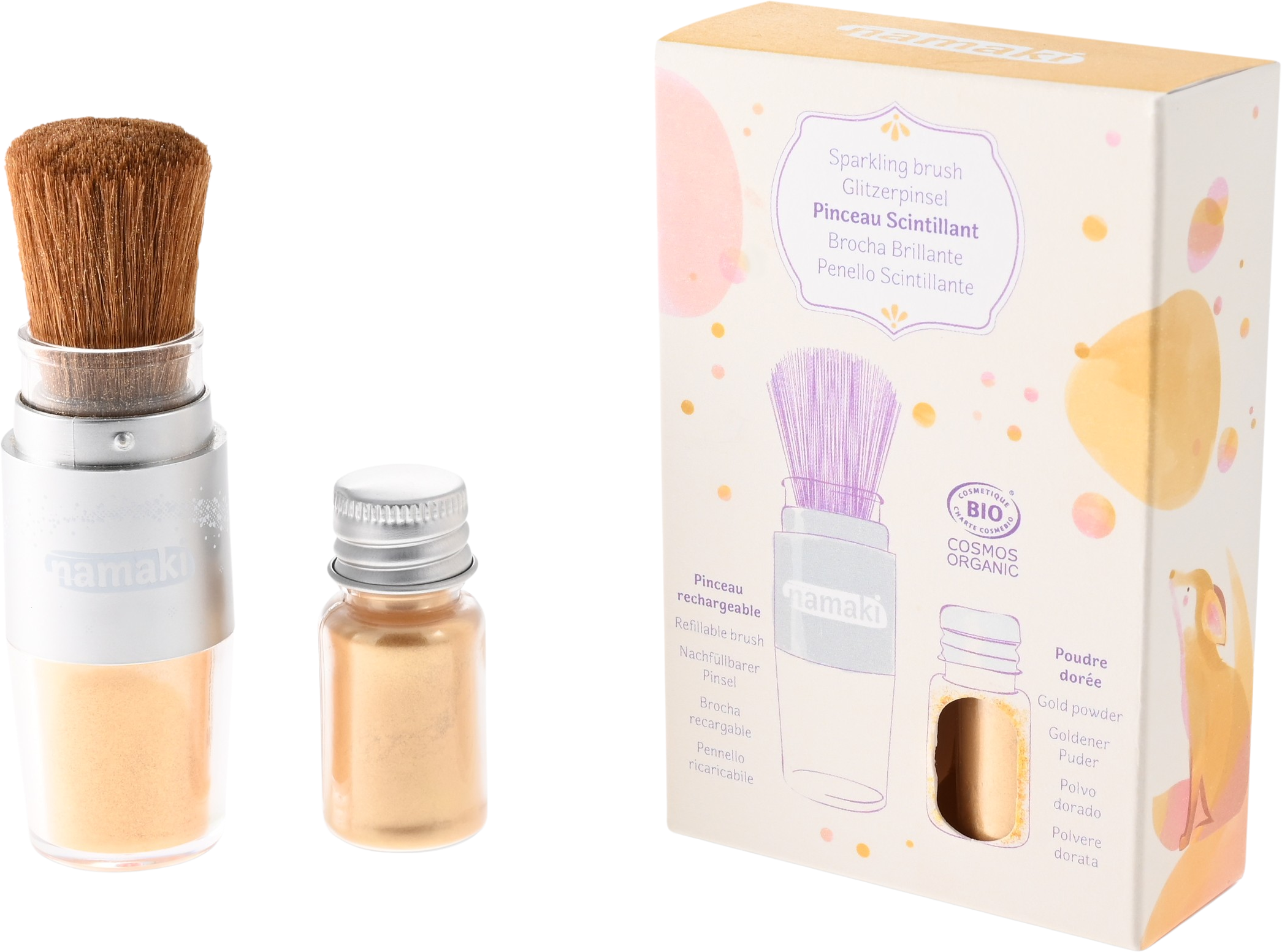 Das goldene Schimmer-Puder von namaki ist zu 100% aus natürlichen und mineralischen Inhaltsstoffen. Damit ist es nicht nur besonders hautverträglich, sondern auch gut für die Umwelt. Es lässt sich mit dem Magic Brush besonders einfach auftragen und unendlich oft nachfüllen- So können kleine Prinzessinen und Feen vom Kopf bis zu den Füßen schimmern!