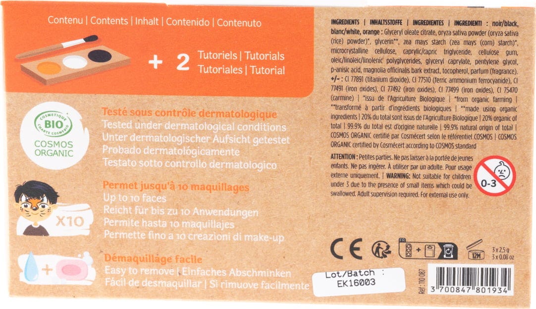 Mit der schwarzen, weißen und orangenen Farbe geht es ab ins Grasland oder den Wald. Als Tiger oder Fuchs machst du dort den perfekten Eindruck! Die Rezepturen sind hypoallergen, sanft zur Haut und sind ganz einfach wieder abzuwaschen.