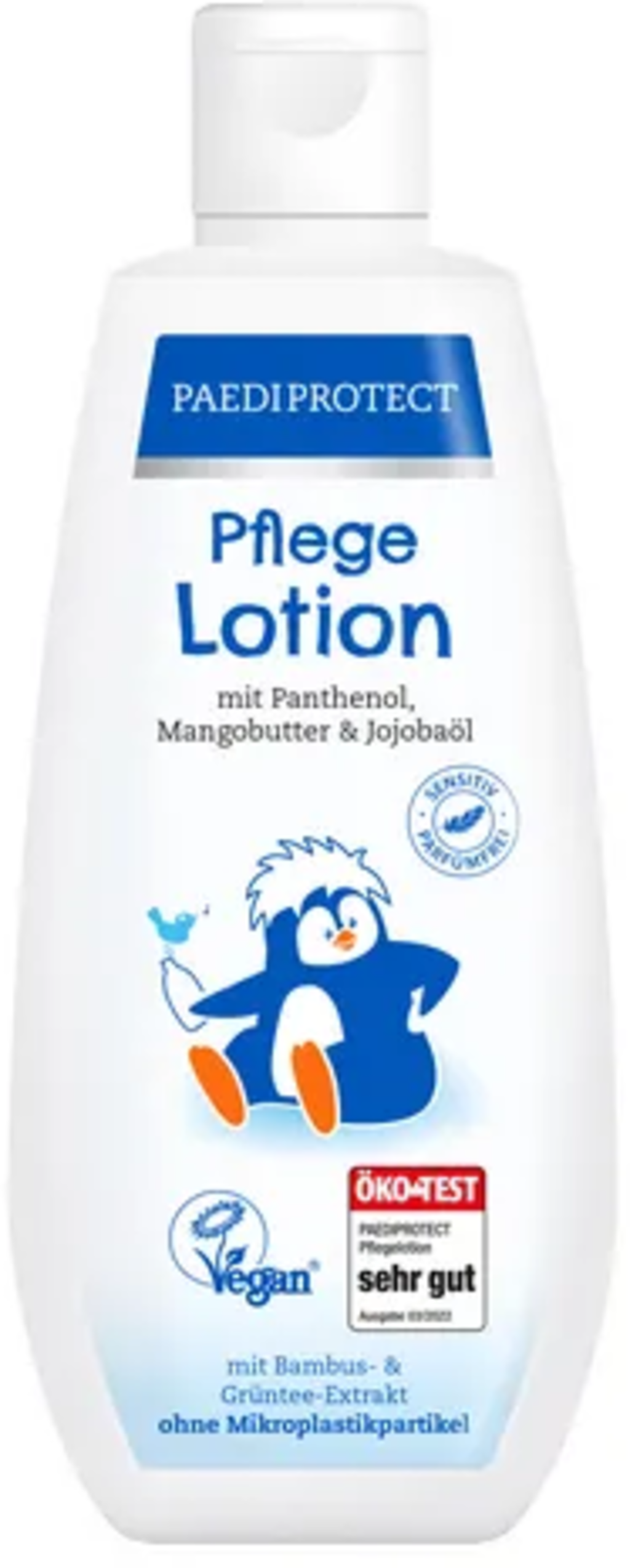Die Pflegelotion von PAEDIPROTECT spendet langanhaltende Feuchtigkeit und unterstützt ein weiches Hautgefühl. Dank veganer, parfümfreier Formulierung eignet sich die Pflegelotion sowohl für empfindliche Baby- und Kinderhaut als auch für sensible Haut von Erwachsenen. Die Lotion enthält wunderbare Extrakte aus Bambus und Grüntee sowie Panthenol, Mangobutter und Jojobaöl.