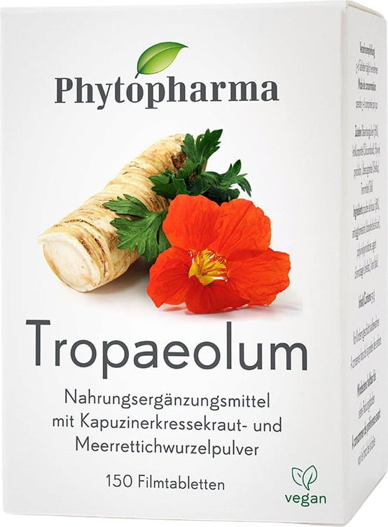 Die Tropaeolum Filmtabletten von Phytopharma enthalten Kapuzinerkressekraut- und Meerrettichwurzelpulver. Die Tabletten sind vegan, laktosefrei und auch für Kinder ab 6 Jahren geeignet.