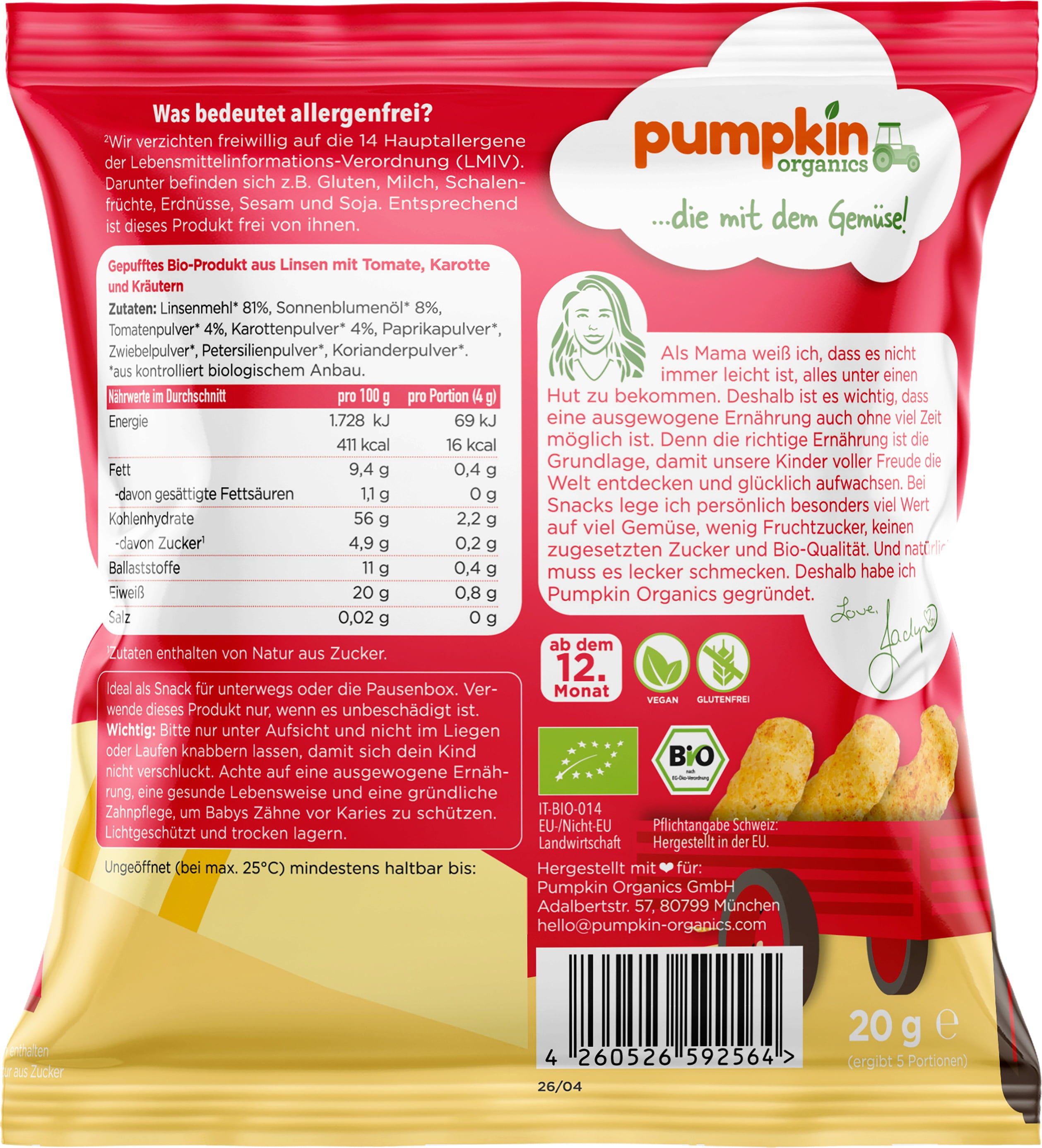 Pumpkin Organics Bio Linsen Puffs 'Tomate, Karotte & Kräuter', 20 g