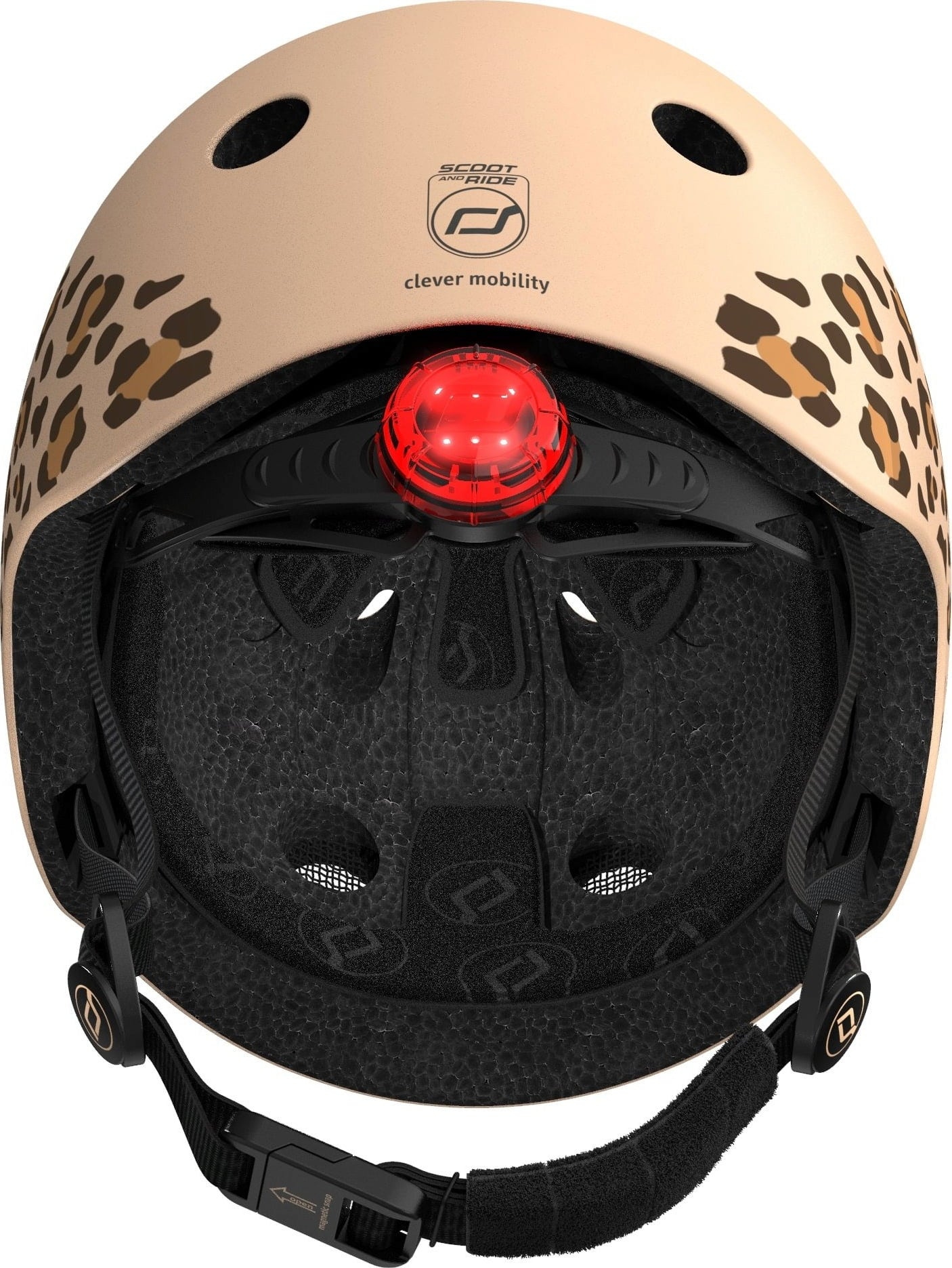 Ein LED-Licht an der Rückseite sorgt für eine verbesserte Sichtbarkeit und die atmungsaktive Polsterung an der Innenseite ist problemlos waschbar. Der innovative Magnetverschluss stellt sicher, dass Kinder bereits ohne die Hilfe ihrer Eltern den Helm öffnen und schließen können, ohne dabei ihre Haut einzuklemmen.
