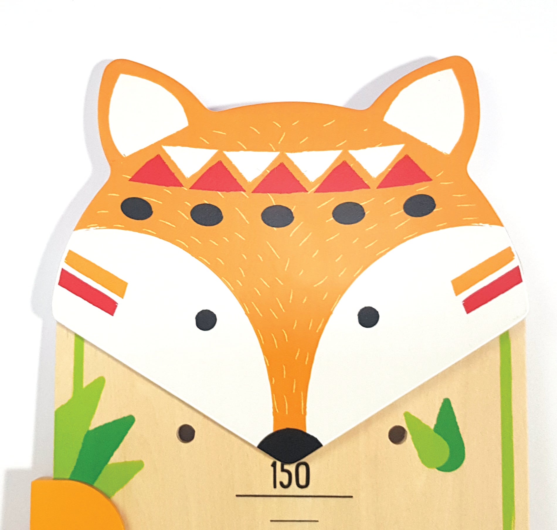 Der schlaue Fuchs weiß immer, wie groß du gerade bist. Er umklammert diese Messlatte in natürlicher Holzoptik und schaut neugierig auf dich herab. Deine Größe wird mit Holzpfeilen markiert, die ganz einfach an den vorbereiteten Öffnungen angebracht werden. Durch das Drehen der Pfeile kannst du die Größe auf den Millimeter genau kennzeichenen. Enthalten sind vier Platten, Schnüre zum Verbinden/Aufhängen und sieben Marker.