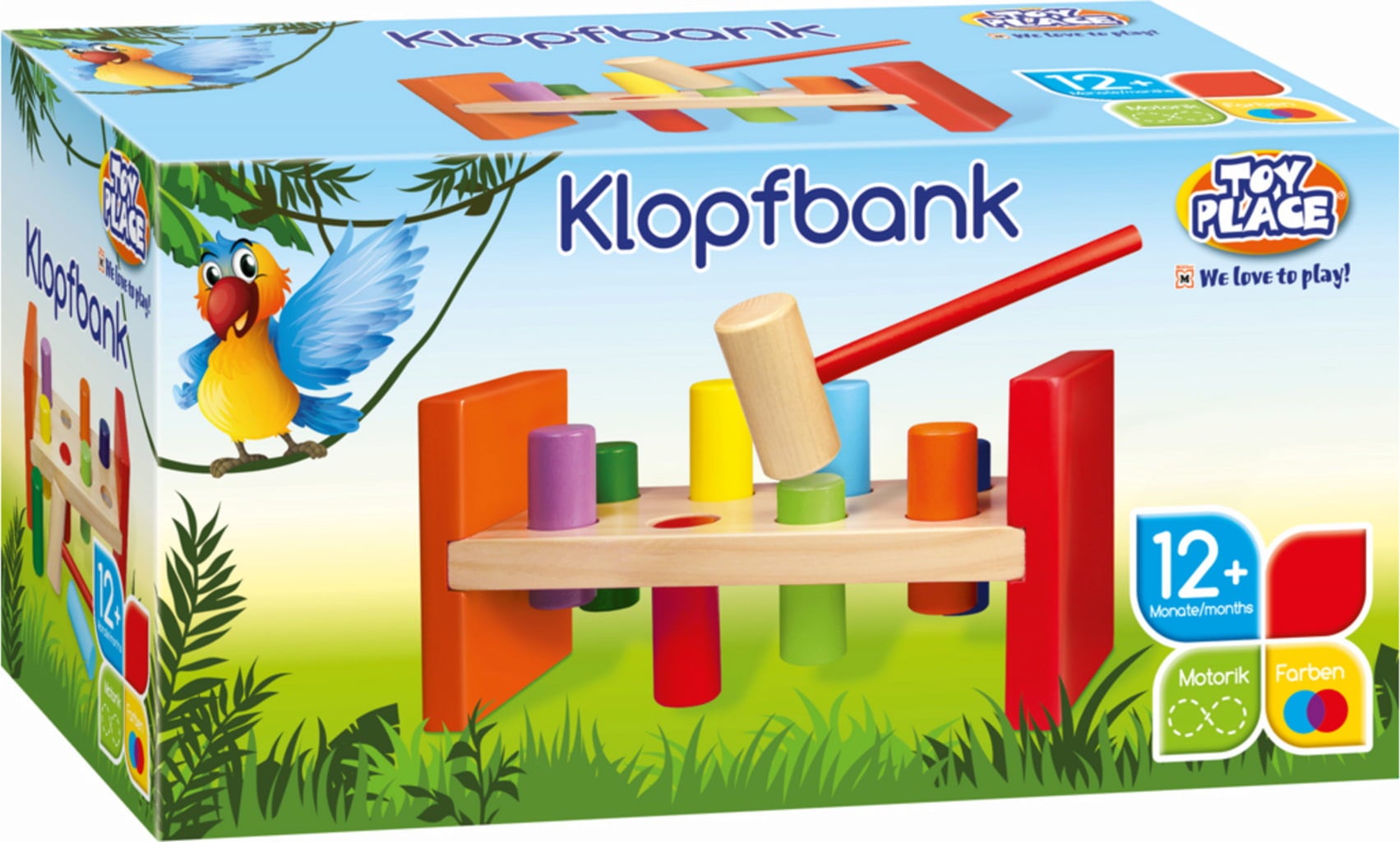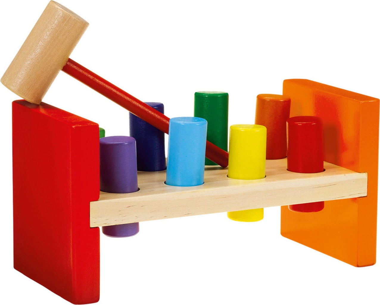 Kinder ab 12 Monate können ihre feinmotorischen Fähigkeiten an dieser bunten Klopfbank testen und trainieren. Auf eine spielerische Weise lernen Kinder die verschiedenen Farben besser kennen und werden dazu ermutigt, wie kleine Handwerker mit dem inkludierten Hämmerchen auf die einzelnen Holzsteine zu klopfen. Sind alle Stifte in die Klopfbank gesteckt, kann diese einfach umgedreht werden und der farbenfrohe Klopfspaß geht weiter!
